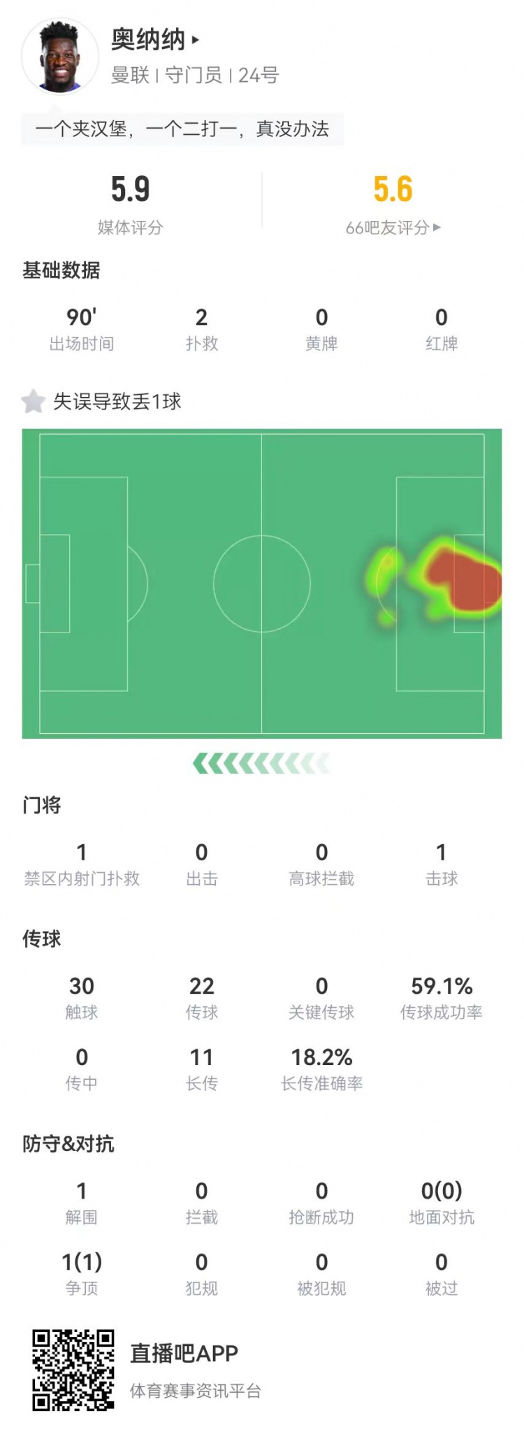 12月27日訊 曼聯(lián)在本輪英超0-2不敵狼隊(duì),奧納納本場(chǎng)數(shù)據(jù)如下: