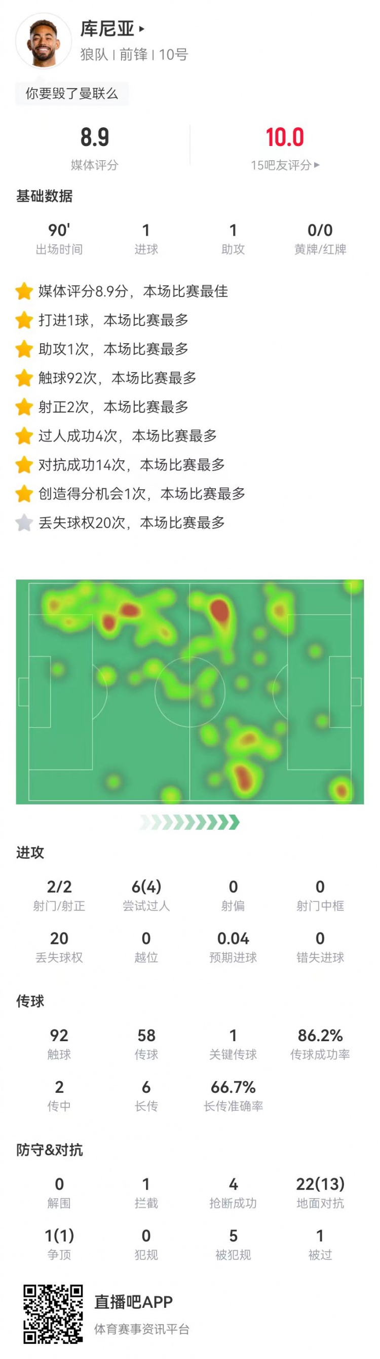 12月27日訊 狼隊在本輪英超2-0擊敗曼聯(lián),庫尼亞本場數(shù)據(jù)如下: