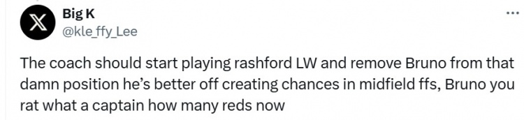 教練應(yīng)該讓拉什福德首發(fā)左邊鋒,把B費從那該死的位置上拿下來,他最好在中場創(chuàng)造機(jī)會。
