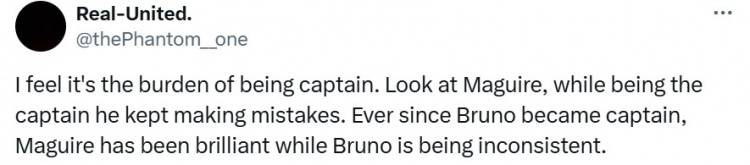 我覺得這是擔(dān)任隊長的負(fù)擔(dān)??纯瘩R奎爾,擔(dān)任隊長期間他不斷犯錯。自從布魯諾成為隊長以來,馬奎爾一直表現(xiàn)出色,而布魯諾則不穩(wěn)定了。
