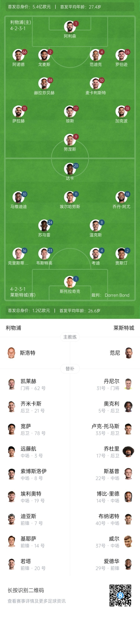 利物浦首發(fā):1-阿利森、66-阿諾德、2-戈麥斯、4-范迪克、26-羅伯遜、38-赫拉芬貝赫、10-麥卡利斯特、17-瓊斯、11-薩拉赫、9-努涅斯、18-加克波