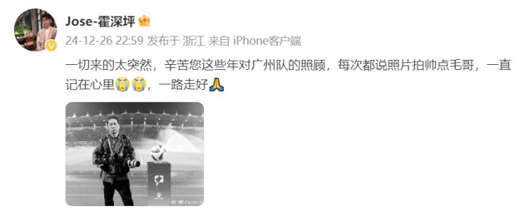 除特別注明外,本站所有內(nèi)容均為24直播網(wǎng)整理排版,轉(zhuǎn)載請注明出處:霍深坪悼念廣州隊攝影師:辛苦您對廣州隊的照顧,一直記在心里