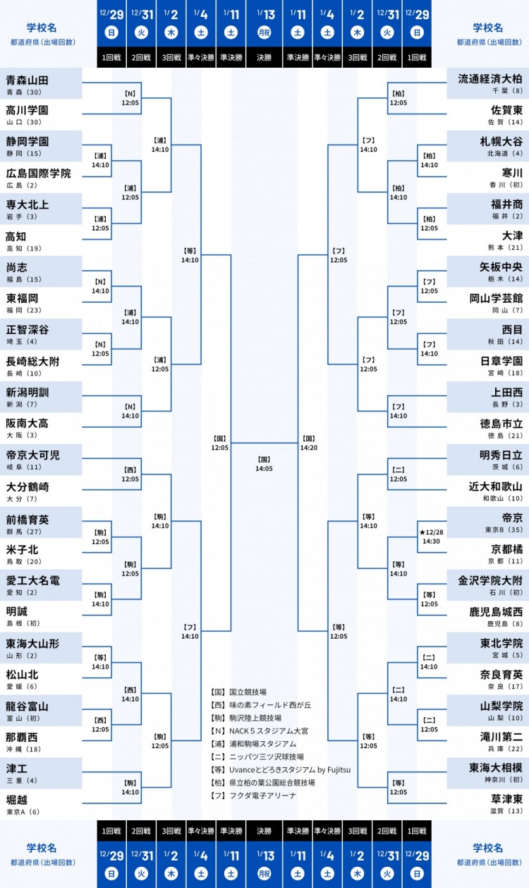 衛(wèi)冕冠軍青森山田首輪將對戰(zhàn)高川學(xué)園,另一支熱門球隊(duì)日章學(xué)園首輪將對戰(zhàn)西目高中。決賽將于明年1月13日進(jìn)行。