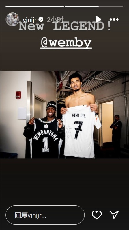 12月27日訊 在個(gè)人社媒,維尼修斯曬出與文班亞馬的合照。