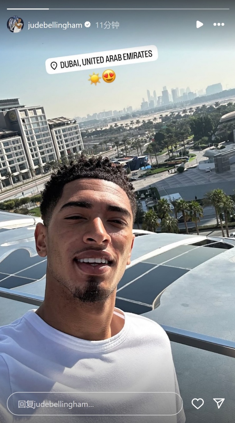 12月27日訊 皇馬中場(chǎng)貝林厄姆更新社媒動(dòng)態(tài),曬出在迪拜度假的照片。