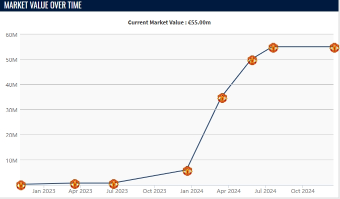 得益于上賽季的出色表現(xiàn),梅努的身價在上半年暴漲,去年12月他的德轉身價還只有600萬歐,而目前他的身價已經來到了5500萬歐。