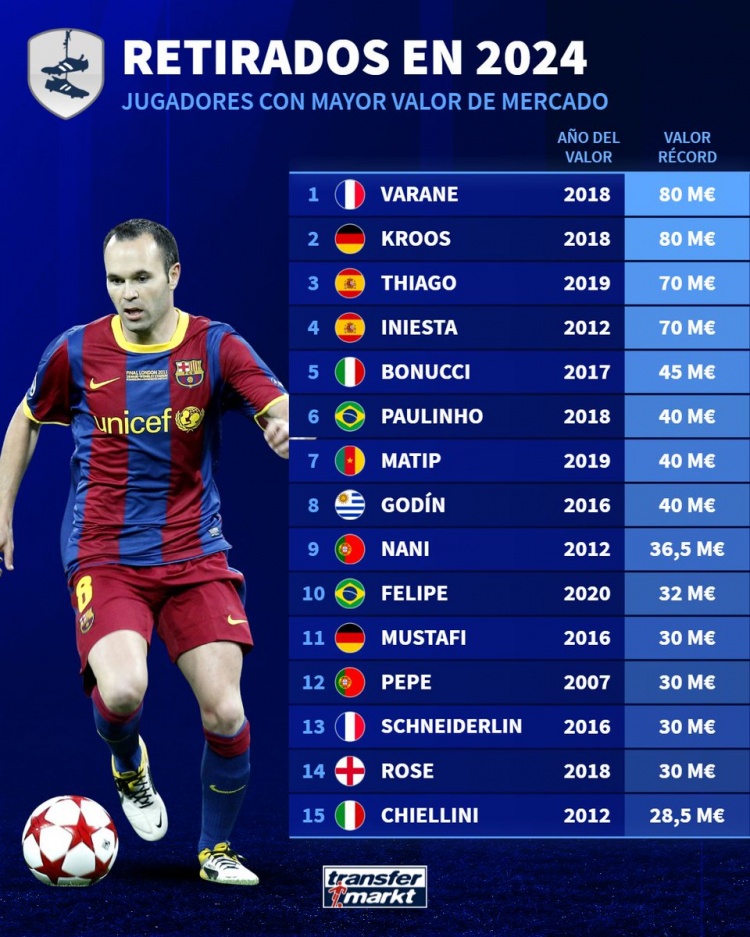 12月27日訊 德國轉會市場列出了今年退役球員的巔峰身價榜,瓦拉內、克羅斯8000萬歐居首,蒂亞戈、伊涅斯塔7000萬歐。