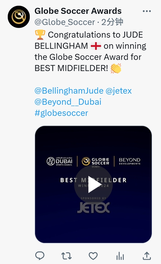 12月27日訊 環(huán)球足球獎(jiǎng)官推剛剛發(fā)布了祝賀貝林厄姆當(dāng)選2024最佳中場(chǎng)的文案,隨后立即刪除了。