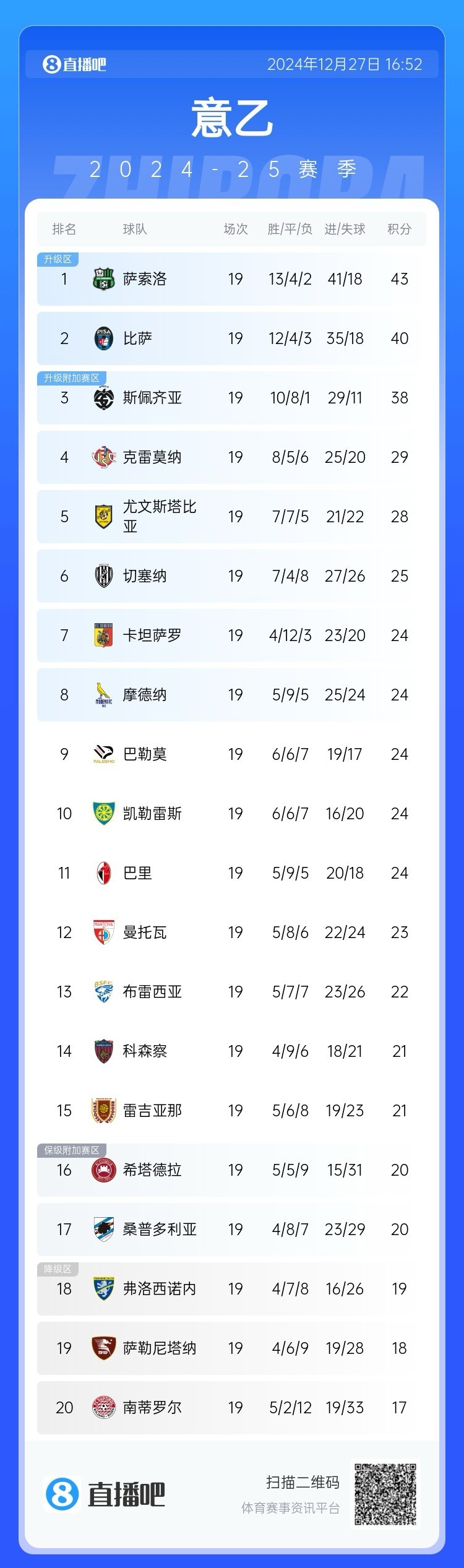 最終,比薩3-1擊敗領(lǐng)頭羊薩索洛,在積分榜上,薩索洛13勝4平2負(fù)積43分領(lǐng)跑積分榜,比薩12勝4平3負(fù)積40分位列次席。