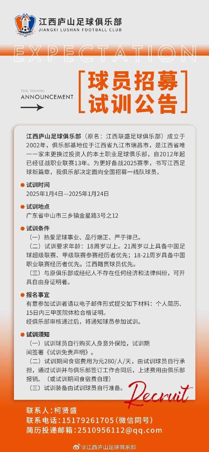 江西廬山足球俱樂部球員招募、試訓(xùn)公告! ???