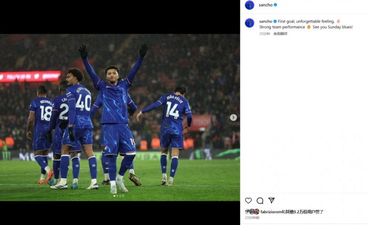 賽后,桑喬更新社媒表示道:第一粒進球,難忘的感覺