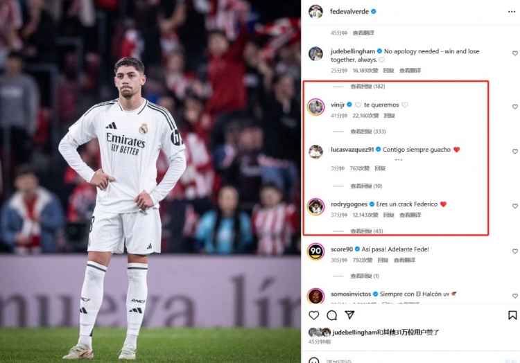 在評(píng)論區(qū),貝林厄姆、維尼修斯、巴斯克斯、羅德里戈都評(píng)論表示了支持。