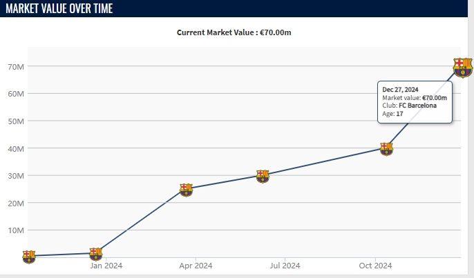 12月27日訊 今日德國轉(zhuǎn)會市場更新西甲球員身價,巴薩17歲的中后衛(wèi)身價漲至7000萬歐,和兩個月前相比上漲3000萬歐,幾乎翻倍。