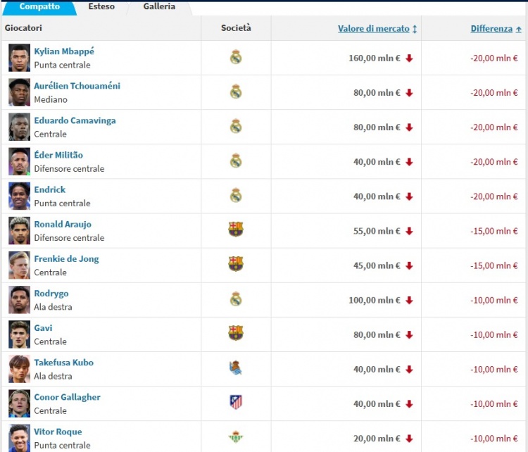 12月27日訊 德轉(zhuǎn)更新西甲球員身價,在跌幅榜中,姆巴佩、瓊阿梅尼、卡馬文加、米利唐、恩德里克都下跌2000萬歐并列第一。