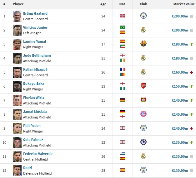 除特別注明外,本站所有內(nèi)容均為24直播網(wǎng)整理排版,轉(zhuǎn)載請注明出處:足壇身價前十:哈蘭德&維尼修斯2億 亞馬爾1.8億超姆總 福登1.4億