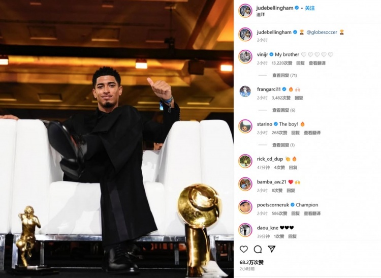 貝林厄姆也通過社媒曬出自己領(lǐng)取環(huán)足獎相關(guān)獎杯的照片,并配文:“@環(huán)足獎