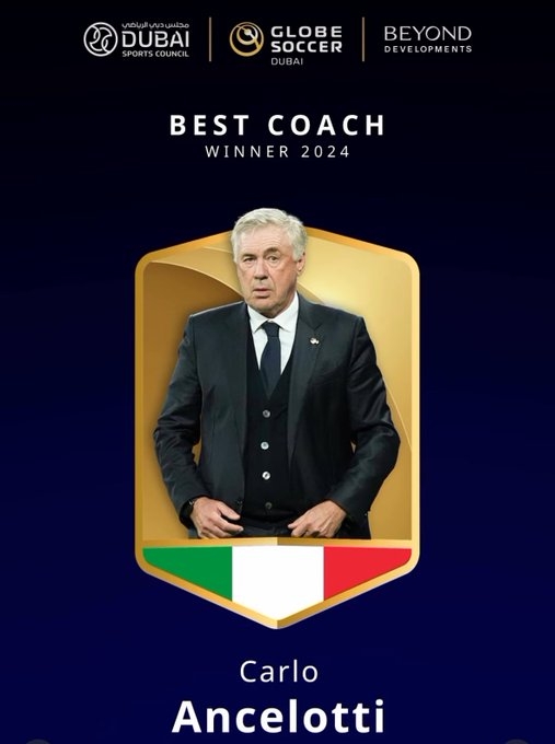 12月28日訊 官方消息,安切洛蒂當(dāng)選2024環(huán)足獎年度最佳教練。