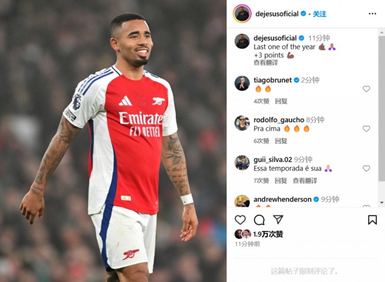 12月28日訊 本輪英超,阿森納主場(chǎng)1-0伊普斯維奇升至第二。此役熱蘇斯首發(fā)72分鐘被換下。賽后,球員更新社媒慶祝勝利。