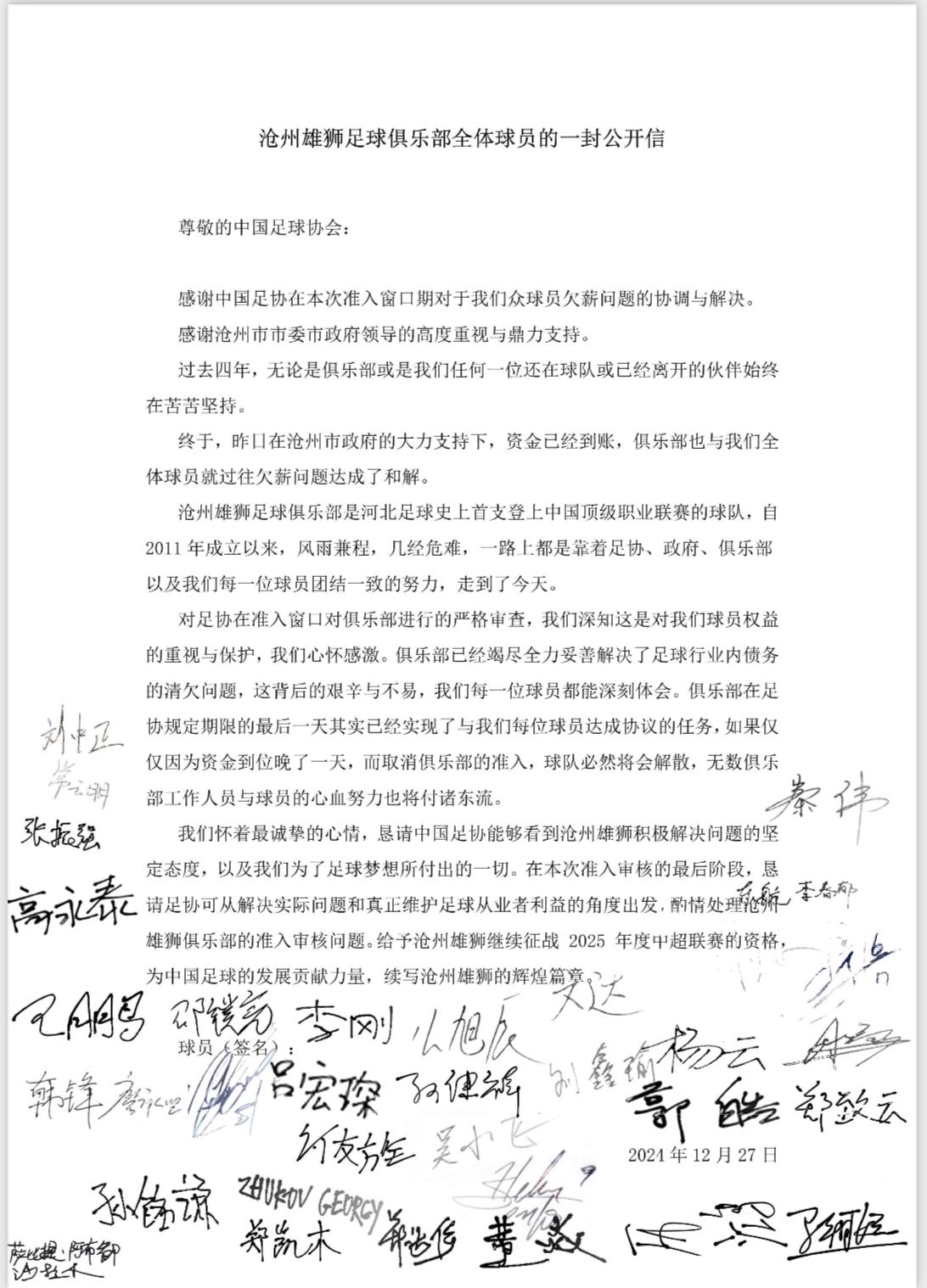 滄州雄獅足球俱樂部全體球員的一封公開信