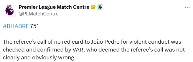 英超官方隨后解釋稱:“裁判沒有以暴力行為為由向若昂-佩德羅出示紅牌,這一決定得到了VAR的核查和確認(rèn),VAR認(rèn)為主裁判的這一判罰并非明顯的誤判。”