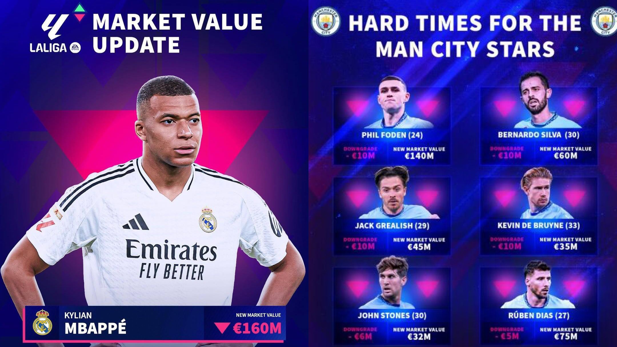 10月身價更新后,皇馬身價13.6億歐,曼城12.6億歐。12月身價更新后,皇馬跌至12.3億歐,曼城跌至11.9億歐。