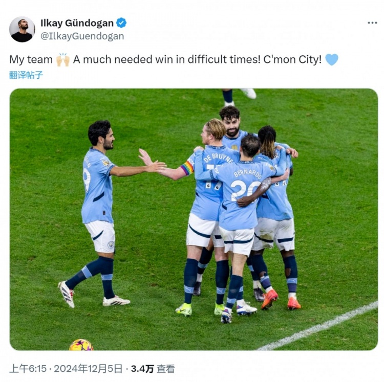 京多安社媒曬出球員們慶祝的照片,并寫道:“我的球隊,在困難時期急需的一場勝利!加油曼城!”