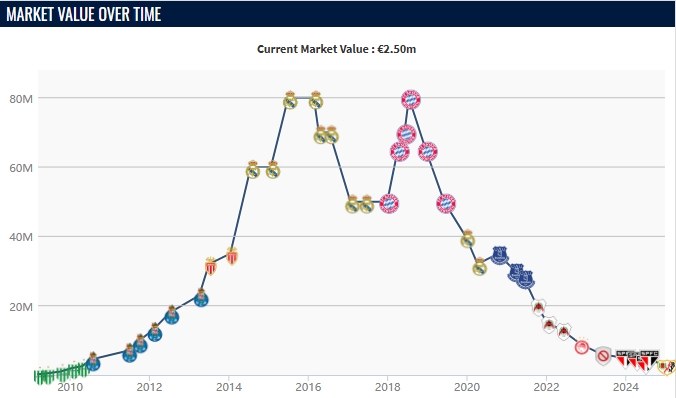 2014年,23歲的J羅7500萬(wàn)歐加盟皇馬,他的巔峰身價(jià)也因那個(gè)賽季的爆發(fā)達(dá)到8000萬(wàn)歐。后來(lái)J羅在效力拜仁期間也有過(guò)不錯(cuò)表現(xiàn),身價(jià)一度回到8000萬(wàn)歐,但之后就是一路下滑。