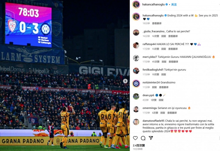 12月29日訊 國(guó)米在本輪意甲3-0完勝卡利亞里,恰爾汗奧盧最后時(shí)刻點(diǎn)射鎖定勝局。
