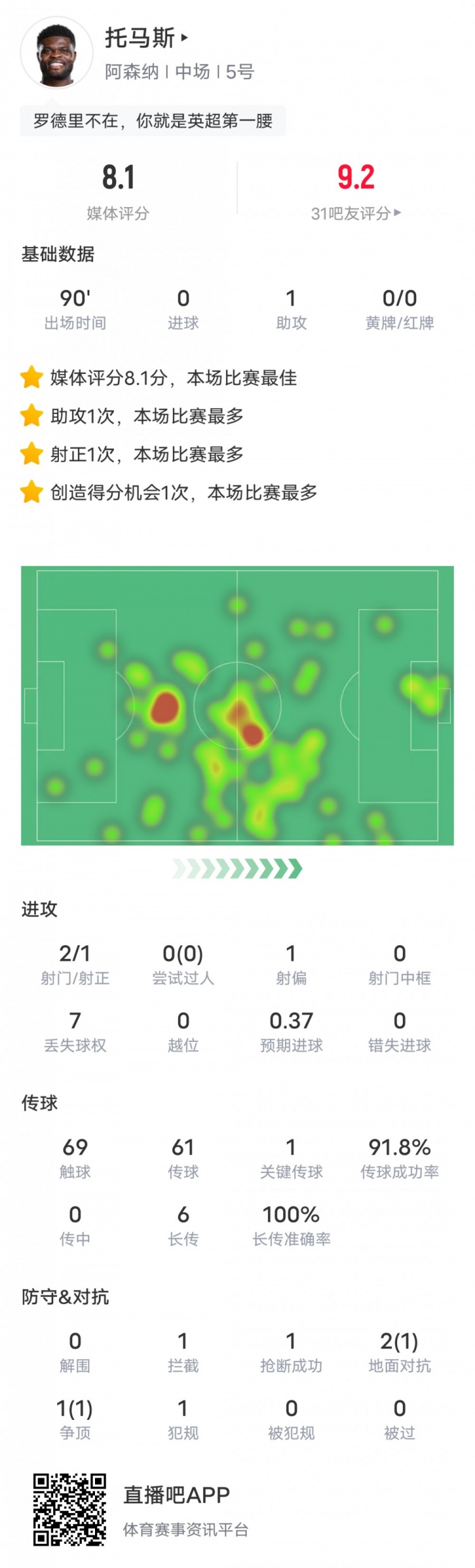 12月5日訊 英超第14輪,阿森納主場2-0曼聯(lián)。托馬斯首發(fā)出戰(zhàn),送出1次助攻,還有1次關(guān)鍵傳球,傳球成功率達(dá)到91.8%,評分8.1全場最高。
