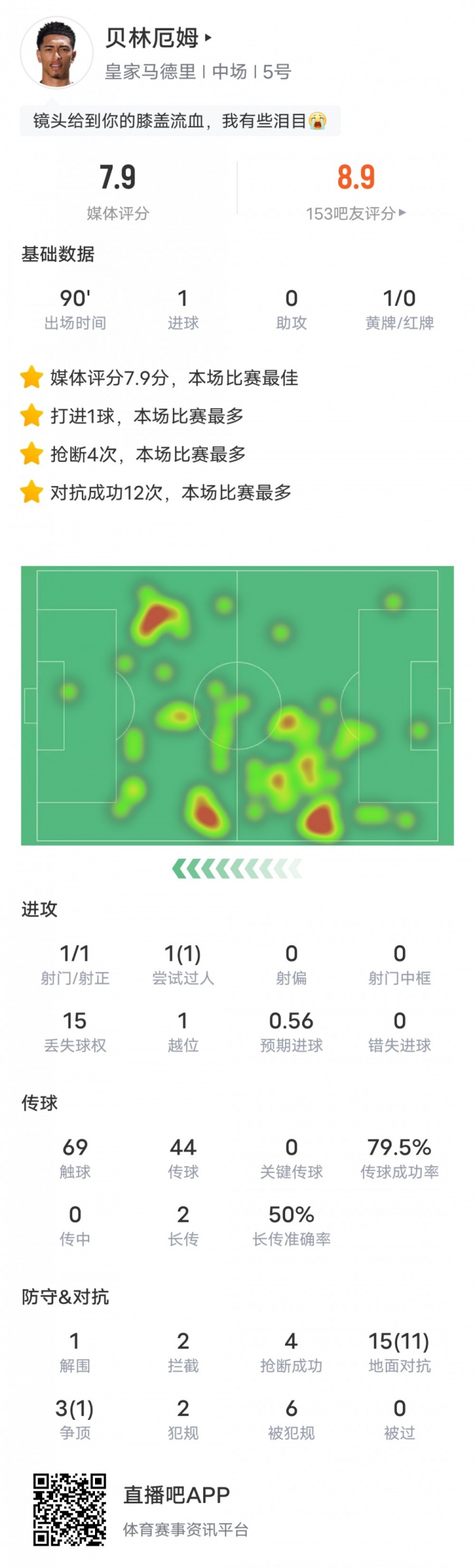 貝林厄姆本場比賽具體數(shù)據(jù)如下: