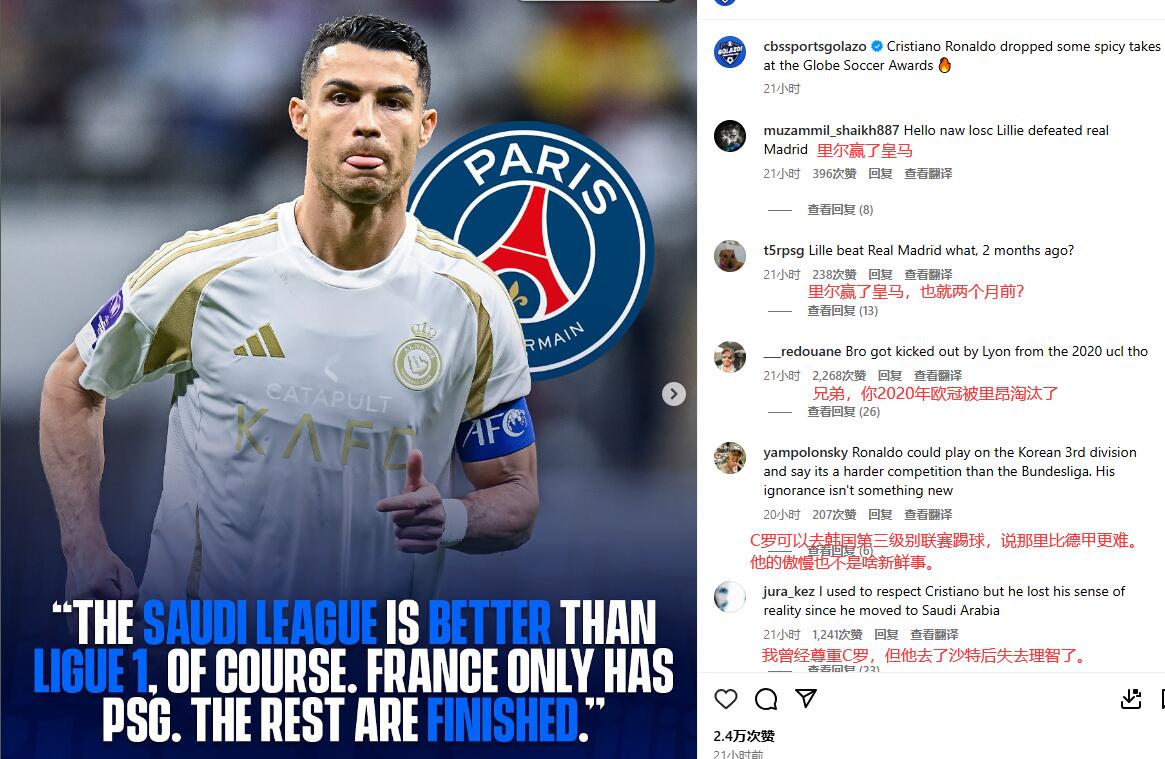 環(huán)足獎頒獎典禮上,C羅再次表示沙特聯(lián)強(qiáng)于法甲,他的言論再次引發(fā)媒體與球迷的熱議。