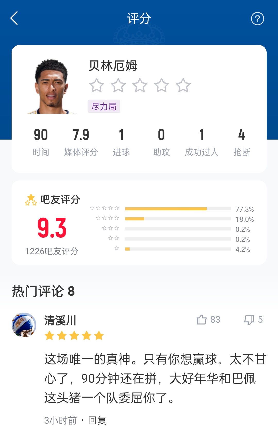 賽后吧友也為他打出了9.3分的隊內(nèi)最高分。