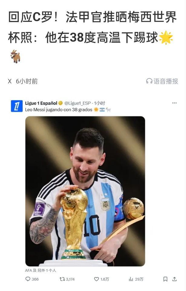 法甲西語官推先后發(fā)了2條推特回應(yīng)C羅,其中第二條推特是曬出梅西贏得2022卡塔爾世界杯的照片,并寫道:“梅西在38度高溫下踢球