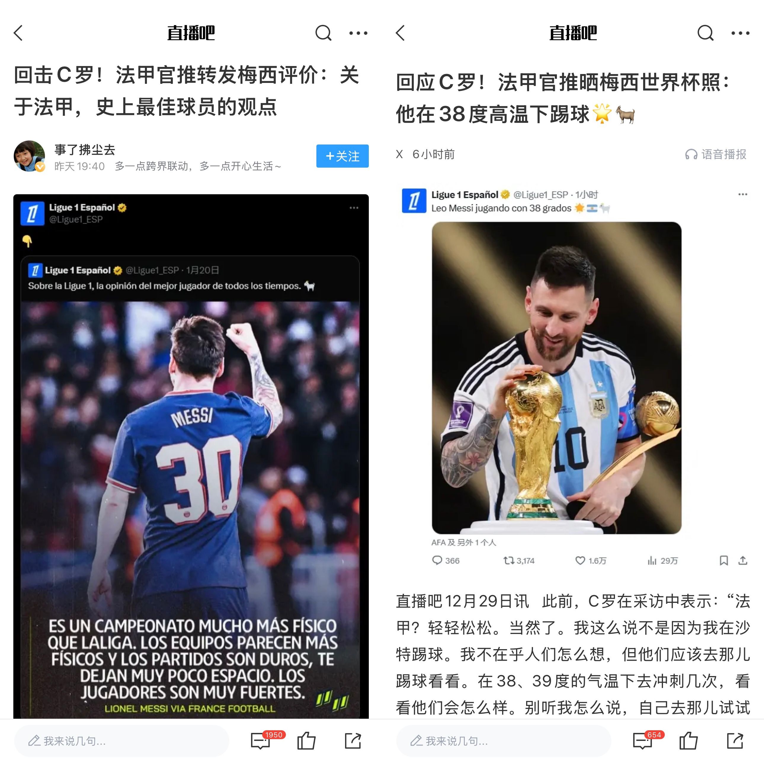 對(duì)于C羅這2次言論,法甲官推前后共4次回?fù)簦渲杏⒄Z(yǔ)官推1次、西語(yǔ)官推3次,法甲西語(yǔ)官推3次都是搬出梅西回?fù)鬋羅。