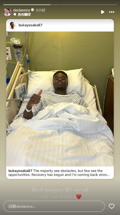 賴斯在社交媒體上轉(zhuǎn)發(fā)薩卡躺在病床上的照片,配文:“更強大地歸來,我們都與你在一起,兄弟?!?/p>