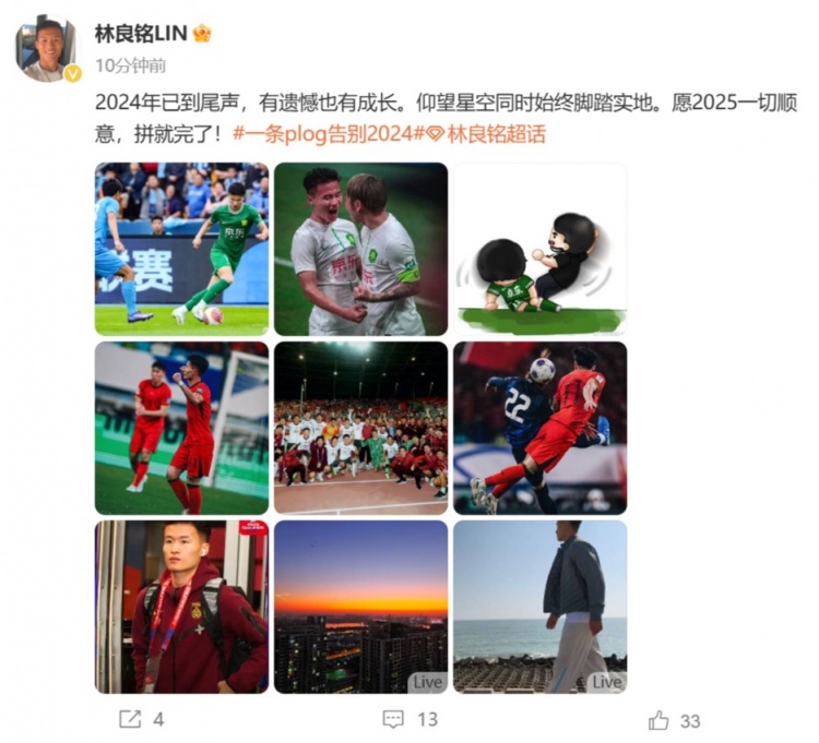 在個人微博,林良銘曬出多張今年為國家隊以及國安出戰(zhàn)的照片,同時配文:“2024年已到尾聲,有遺憾也有成長。仰望星空同時始終腳踏實地。愿2025一切順意,拼就完了!”
