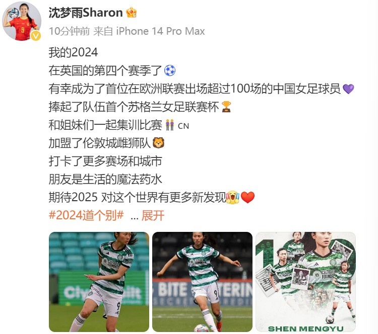 12月29日訊 中國女足國腳沈夢雨在社媒分享照片,并配文:“我的2024,在英國的第四個賽季了,有幸成為了首位在歐洲聯(lián)賽出場超過100場的中國女足球員,捧起了隊伍首個蘇格蘭女足聯(lián)賽杯,和姐妹們一起集訓(xùn)比賽,加盟了倫敦城雌獅隊,打卡了更多賽場和城市?!?/p>