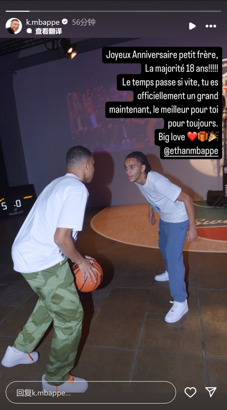 姆巴佩曬出與伊桑打籃球的照片,并配文:“小弟,18歲生日快樂(lè)!時(shí)光飛逝,你已經(jīng)正式長(zhǎng)大成人了。永遠(yuǎn)祝福你。給你大大的愛(ài),伊桑?!?/p>