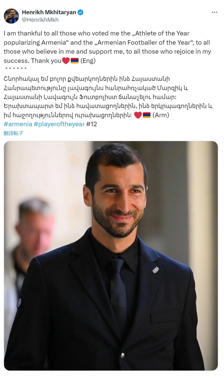 12月29日訊 國(guó)米中場(chǎng)姆希塔良當(dāng)選2024年亞美尼亞足球先生(第12次當(dāng)選)、最受歡迎運(yùn)動(dòng)員,他在社交媒體上發(fā)文致謝。