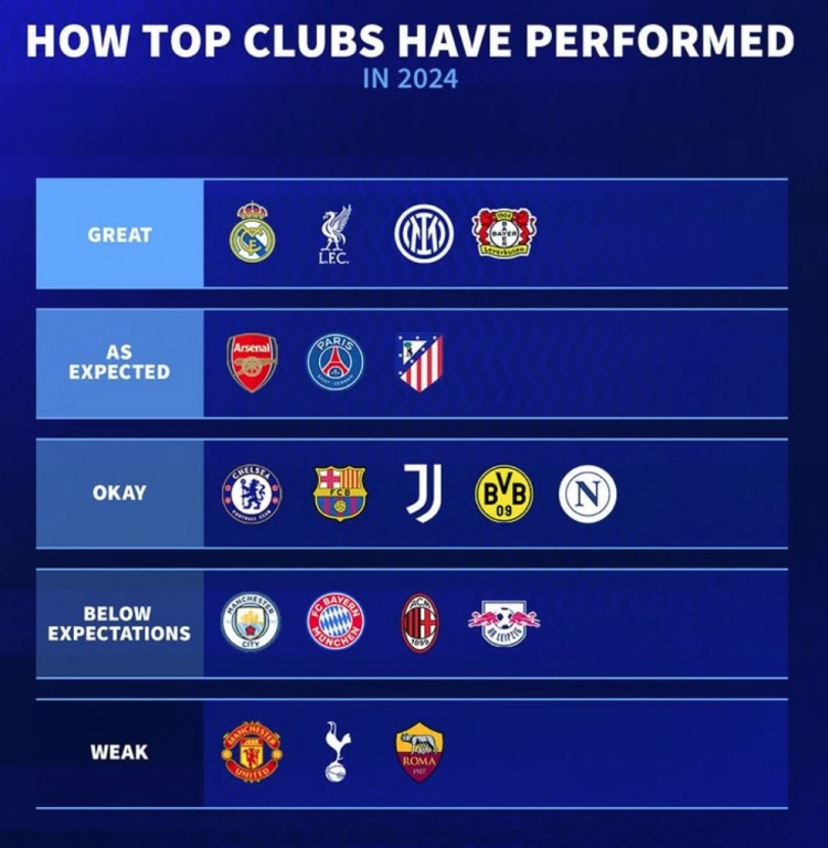 12月29日訊 2024年臨近尾聲,《轉(zhuǎn)會(huì)市場》也為多家頂級俱樂部的2024年表現(xiàn)進(jìn)行了分檔評級。