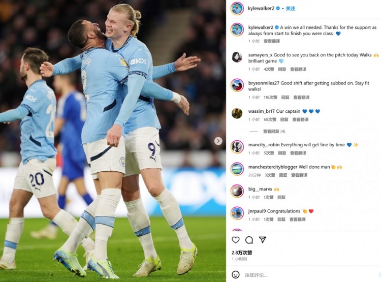 他也在賽后通過社媒曬出自己和哈蘭德相擁大笑的慶祝照,并表示:“我們都需要這場(chǎng)勝利。感謝球迷們從始至終的支持,你們真的很棒?!?/p>
