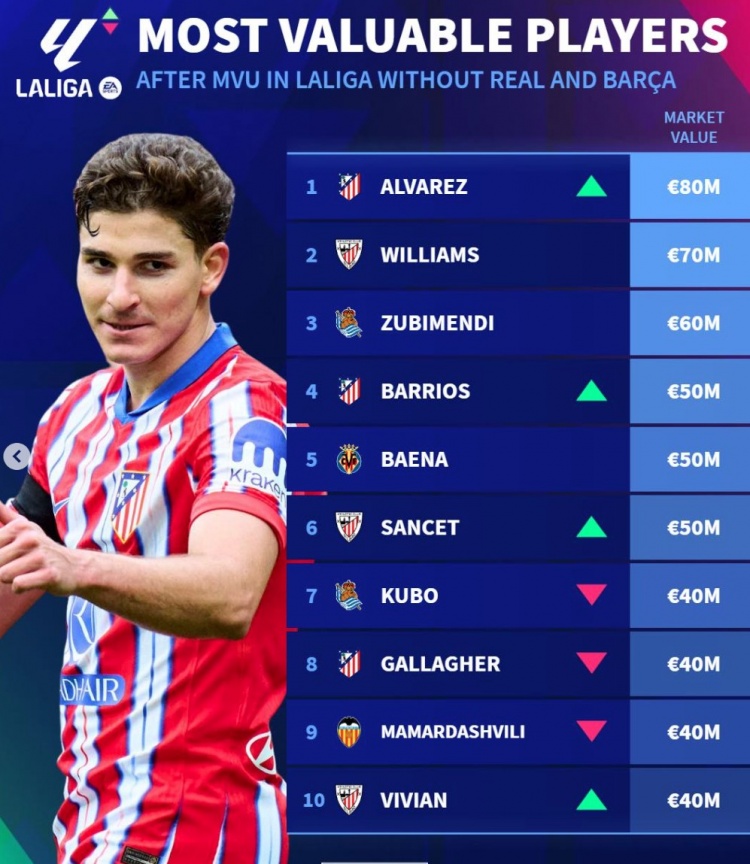 12月30日訊 《轉(zhuǎn)會(huì)市場(chǎng)》近日更新西甲球員身價(jià),并列出了皇薩之外的西甲球員最貴榜,馬競(jìng)畢巴各3將。