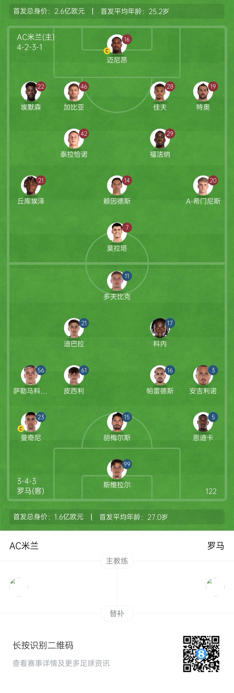 米蘭首發(fā):16-邁尼昂、22-埃默森、46-加比亞、28-佳夫、19-特奧、29-福法納、42-泰拉恰諾、21-丘庫埃澤、14-賴因德斯、20-希門尼斯、7-莫拉塔