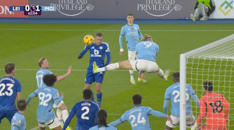空中一字馬哈蘭德飛身高高躍起,試圖封堵瓦爾迪頭球?♂