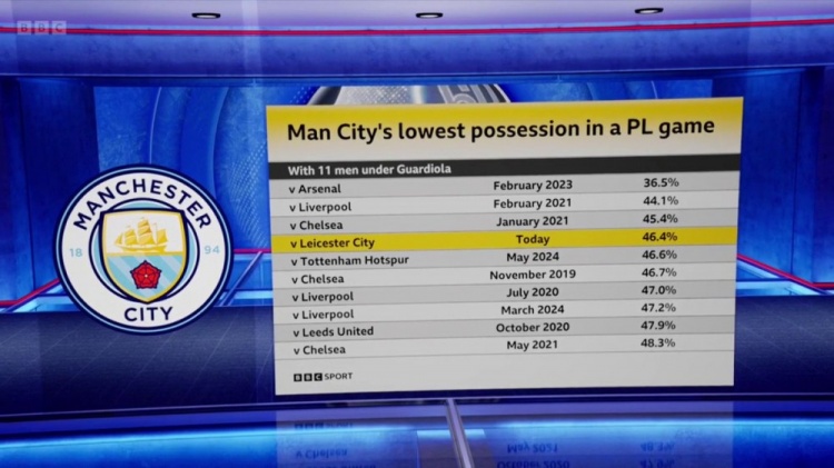 12月30日訊 英超第19輪比賽,曼城客場(chǎng)2-0擊敗萊斯特城。據(jù)BBC統(tǒng)計(jì),此役曼城控球率46.4%,這是瓜帥上任以來(lái)曼城在11人情況下控球率第4低的英超比賽。