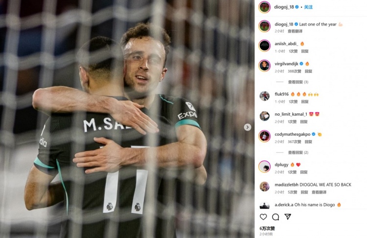 薩拉赫在最后時刻一條龍推進,替補登場的若塔接到分球推射破門,他也曬出和前者相擁慶祝照并表示:“年度最后一戰(zhàn)”。