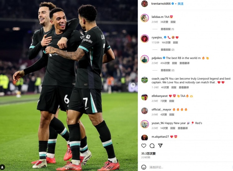 阿諾德也在本場比賽外圍遠射后變線入網(wǎng),這位合同明夏到期的利物浦青訓并未附加文字說明,只是曬出了和隊友的慶祝照。
