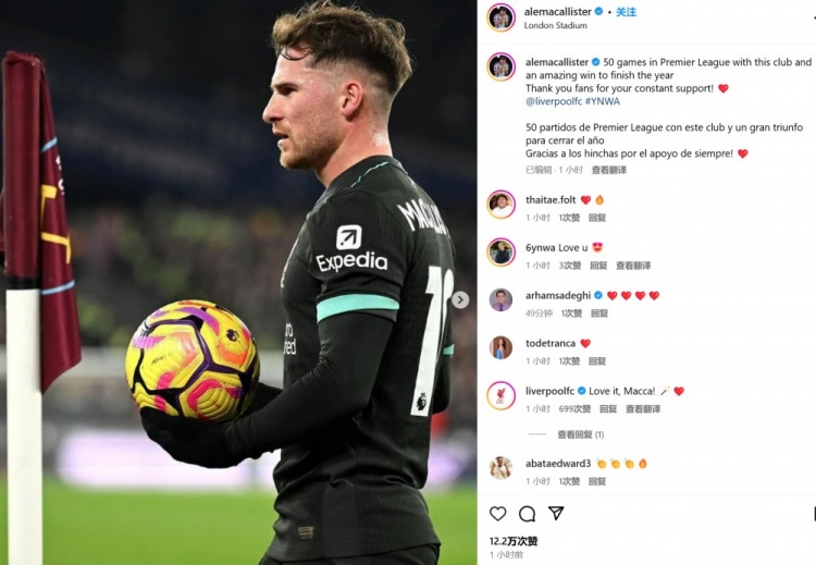 他也在賽后通過社媒曬出自己的比賽照,并配文:“達(dá)成為利物浦效力的英超50場,并以一場美妙的大勝結(jié)束這一年。感謝球迷們一直以來的支持?!?/p>