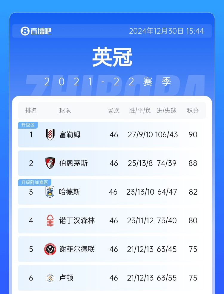 而很巧合的是,森林升超的21/22賽季英冠,三支升超隊分別是:富勒姆、伯恩茅斯、諾丁漢森林(附加賽升級)。而現(xiàn)在,這三只隊正處于:英超第2(森林)、英超第6(伯恩茅斯)、英超第8(富勒姆)。