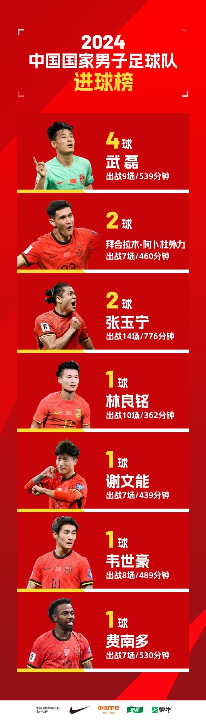 發(fā)布時間:2024年12月30日 16:00點擊:欄目:足球新聞 7人取得正賽進球、合力破門12次,武磊領銜2024中國男足國家隊進球榜 除特別注明外,本站所有內(nèi)容均為24直播網(wǎng)整理排版,轉(zhuǎn)載請注明出處:7人取得正賽進球、合力破門12次,武磊領銜2024國足進球榜 本文標簽: 足球 中超 中國足球 中國男足 上海海港 北京國安 上海申花 深圳新鵬城 轉(zhuǎn)載